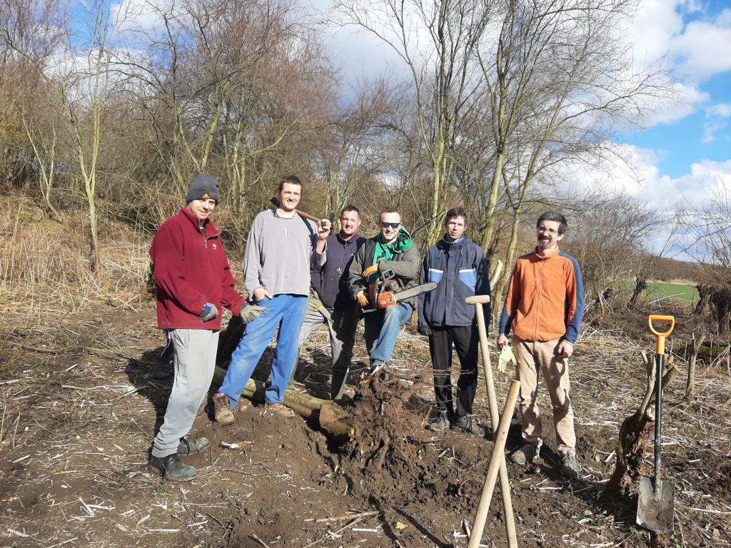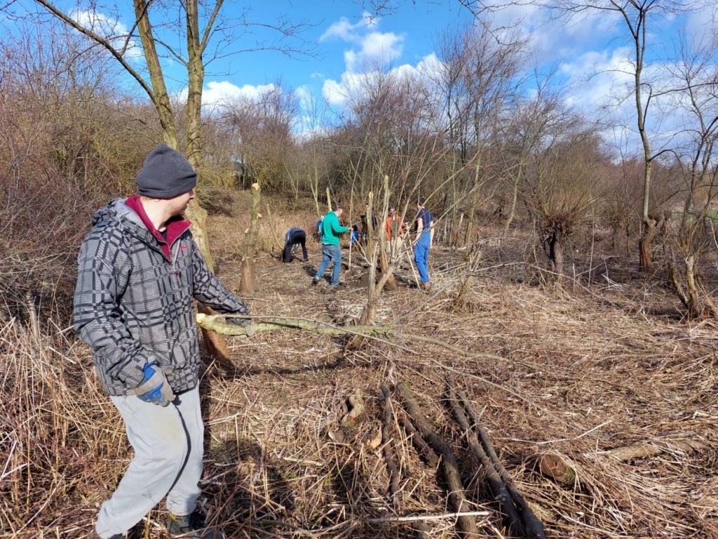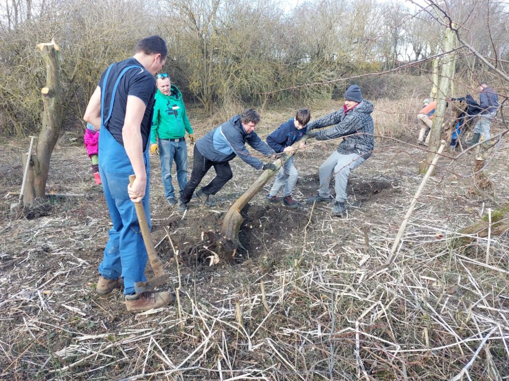 Rozhodli jsme se, že uděláme prořez náletových stromů, aby měly vrby dostatek světla a lépe se jim dařilo. Museli jsme si na obci vyřídit povolení ke kácení dřevin mimo les, jelikož se jedná porost větší než 40m2. Nálety jsme vykopávali ze země i s kořeny, aby pařezy znovu neobrostly. Byla to fyzicky náročná práce, proto jsme nestihli vykácet všechny náletové stromy, které jsme chtěli.