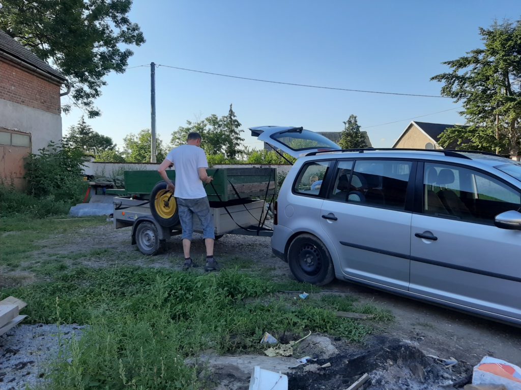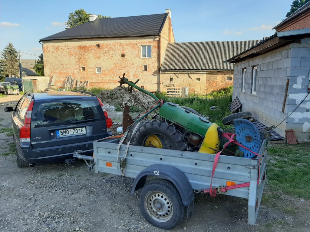Mezi úvahy nad realizací prvního projektu se začaly vkrádat otázky. Jak budeme na pozemek dopravovat materiál, když k němu nevede pořádná cesta? Třeba na stavbu oplocenky? Jak budeme kosit trávu mezi stromy? Odpověď poskytl Libor, jehož velkým koníčkem jsou motocykloví veteráni. Jeho řešení nese název „PF62“. Nejdrív jsem si myslel, že to má něco společného s novoročním přáním do roku 1962. Jenže zkratka PF nebyla Pour Feliciter, ale Půdní Fréza :-). Časově jsem však nebyl daleko. Libor našel bazarový inzerát na slavný výrobek podniku Agrostroj Prostějov, Motorobot PF62. Tento konkrétní kus byl vyroben v r. 1960. Dobrodružstvím byl už jen převoz nepojízdného zemědělského stroje cca 60 km. Povedlo se to na dvou přívěsných vozících: