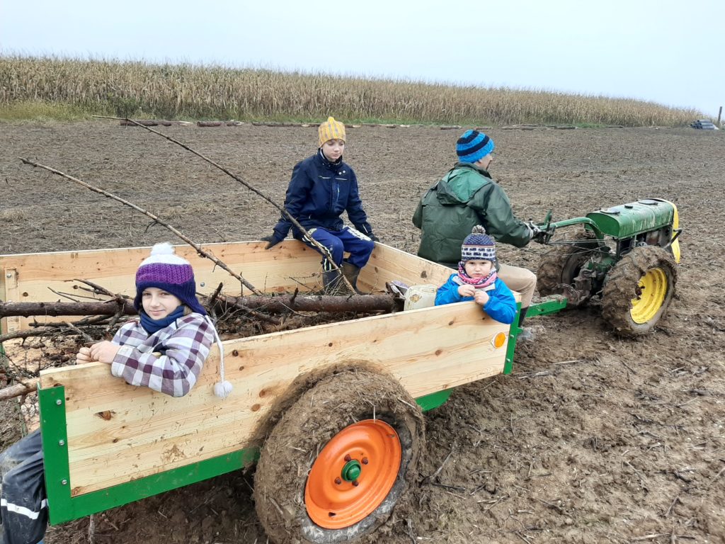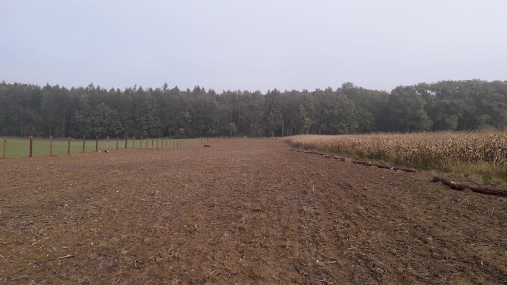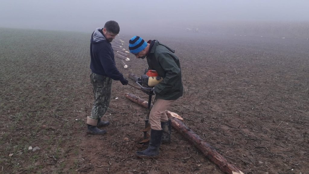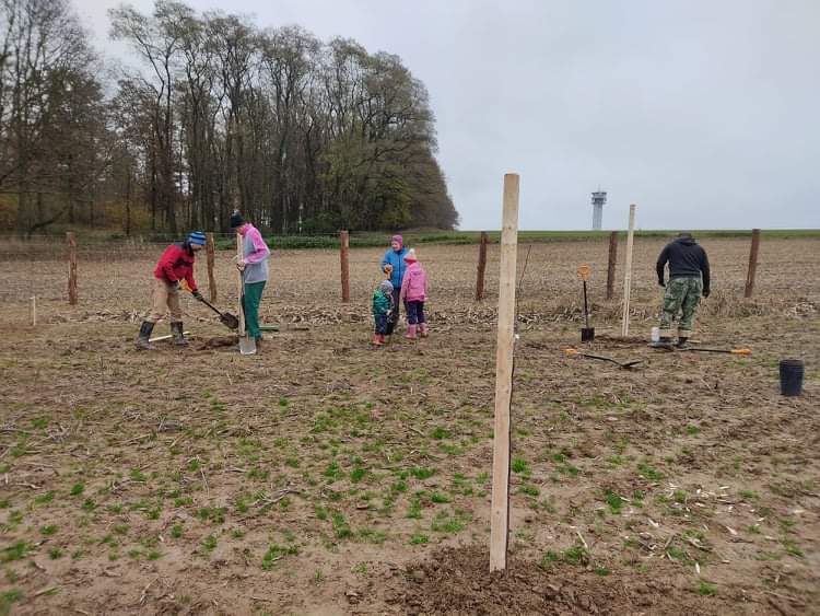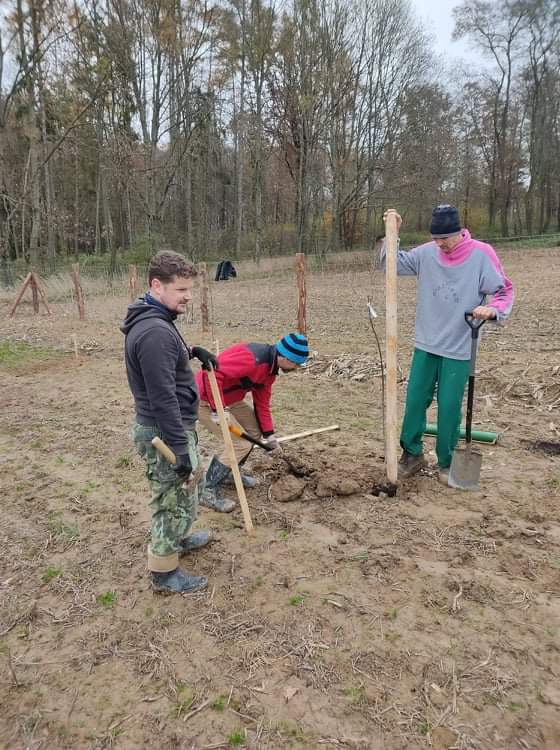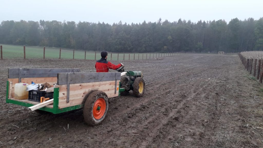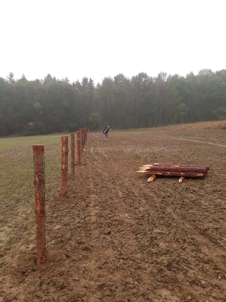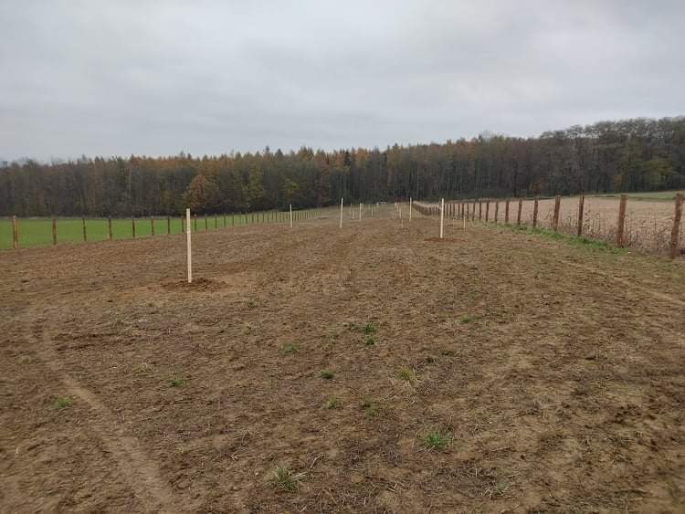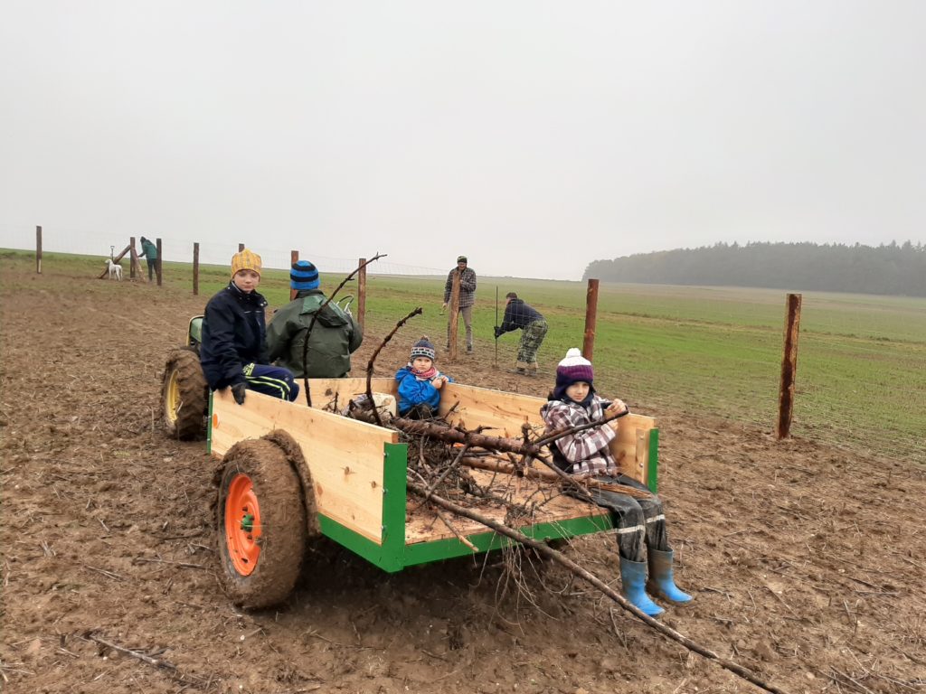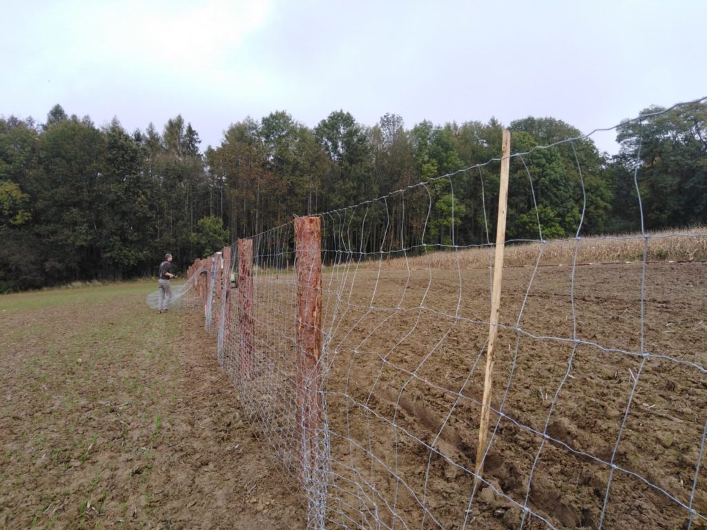 Moc jsme chtěli stihnout podzimní termín výsadby sadu. Nakonec se to podařilo během dvou víkendů v říjnu a listopadu. Oplocenku jsme postavili z modřínových kůlů průměru 15cm. Nakoupili jsme je za dobrou cenu v Hranicích-Slavíči a dovezli nám je až skoro k pozemku. Lesnické pletivo jsme objednali z internetového obchodu, dovoz se podařil až na pozemek. Nejlepší představu o průběhu poskytnou fotky…