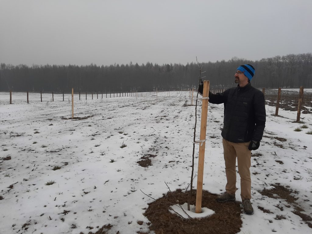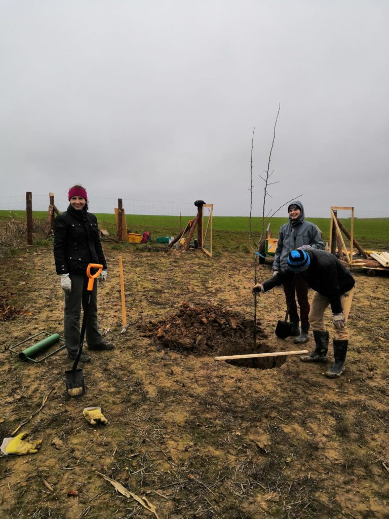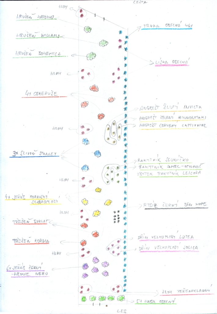 Samotnou výsadbu předcházelo shánění sazenic stromů a keřů. Nakonec se podařilo nakoupit vše potřebné ve dvou školkách. U pana Peška v Bojkovicích a u pana Sukeníka v Tvarožné (kousek od Brna). Sazenice jsme se snažili pořídit na semenných podnožích, ve tvarech vysokokmenu. Chceme mít v sadu velké, dlouhověké stromy, které budou plodit po několik generací. Před výsadbou stromů jsme také zaseli trávní semeno s příměsí kvetoucích rostlin.